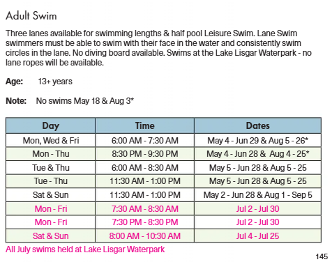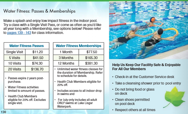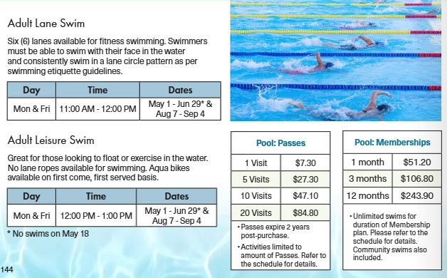 The pool is divided for length swimmers and leisure swimmers. Lane swim etiquette rules apply. No diving board available. Aqua bikes are available on a first come, first serve basis.